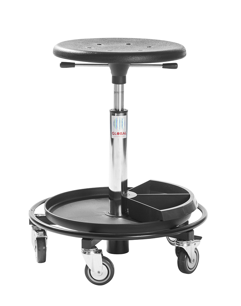 Den solide stålbase med fodring og værktøjsbakke giver et stabilt arbejdsudgangspunkt, mens drejehjulene gør det nemt at manøvrere stolen rundt under montage- og serviceopgaver.
